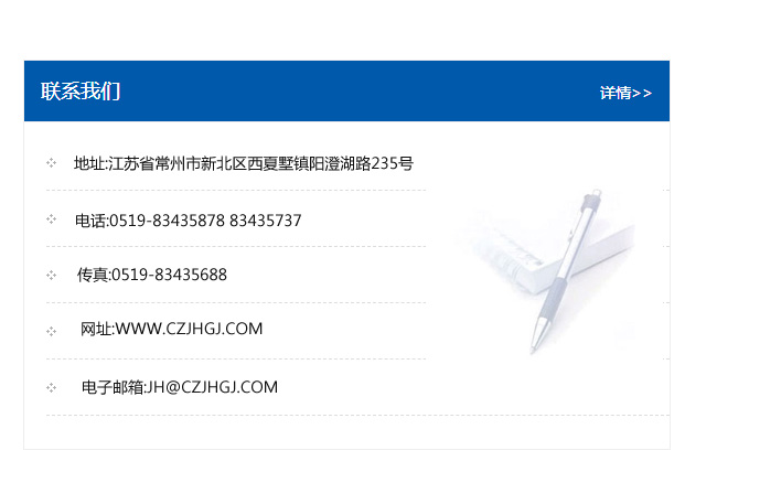 地址:常州市新北區友邦商務大廈1幢16、17層  電話:0519-85101652  傳真:0519-85112595  郵編:213022  網址:www_cz-jiayue_cn.shhuko.com  郵箱:xiajifengaa@163.com
